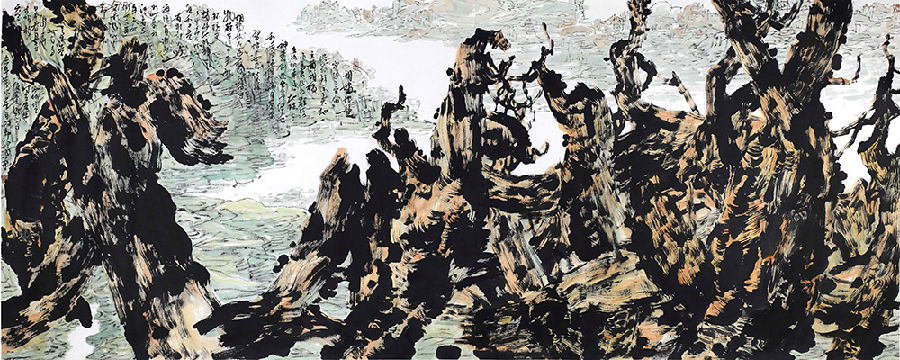 傳統繪畫尤其是文人畫,借物抒懷、托物言志,繪畫多取荒寒蕭疏之景、殘山剩水之境、閒草野鶴之隅,以宣泄自我、聊以自娛。而張錄成繪畫關注人與自然、關注時代氣息、關注人類命運,用遼遠、雄渾、空曠與廣袤抒發個人胸襟,用悲壯、激情、奔放、熱烈以及群體意象表現整體生命的警醒、時代蓬勃的律動。