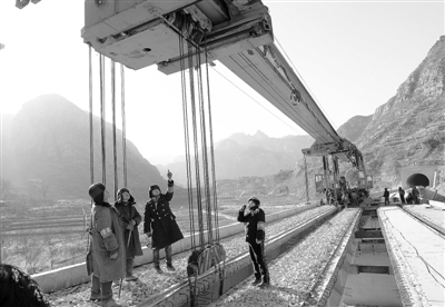 1月20日,技術人員在施工現場指揮施工。當日,山西中南部鐵路通道吾沿河隧道向東鋪架施工工地完成最後一根特大橋梁架設任務,標志著這條橫跨晉豫魯三省,直抵山東日照港的我國西煤東運的黃金大通道建設進入收官階段,為2014年年底全線建成通車奠定了基礎。