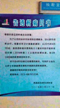 昨日,重慶市第三軍醫大學大坪醫院血液透析室一工作人員稱,3月31日晚接到衛計委的收費調整通知,將恢復到醫療調價前的收費標準。