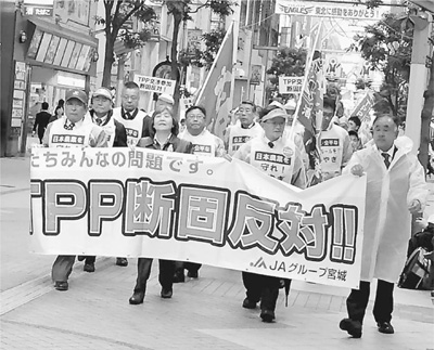 近日,日本東北地區的農業團體舉著寫有“堅決反對TPP”字樣的橫幅,在仙臺市中心舉行示威遊行。