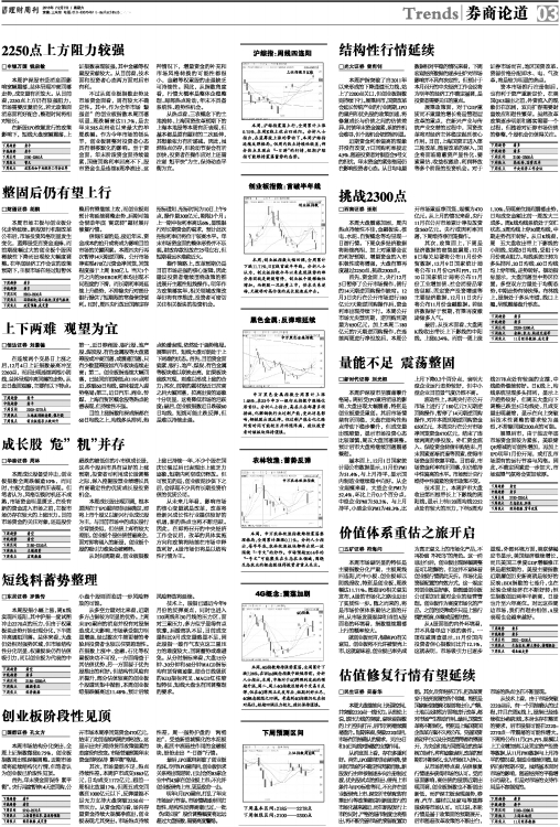 本周滬深股市受消息面影響寬幅震蕩,總體呈現衝高回落走勢,成交量有所放大。從目前看,2250點上方仍有較強阻力,市場需要反復消化,若無政策面消息面利好配合,整理時間將相對較長。