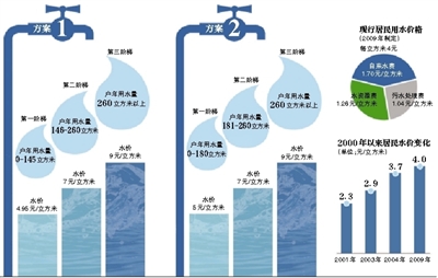 北京水價調整方案昨日公布,在現行每噸4元的基礎上,提出擬上調0.95元或1元兩個方案。兩套方案均設置了階梯水價,根據用水量的不同,兩套方案水價分別為4.95元、7元、9元以及5元、7元、9元;基準水量分別為145立方米及180立方米。方案以年度為計價周期。