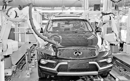 12月28日,位于湖北襄陽高新區的英菲尼迪東風日產襄陽工廠轎車組裝生產線上,機器人正在組裝轎車。本報記者 李樹貴攝