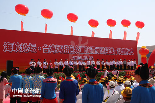 臺灣媽祖信眾直航湄洲進香團今天下午抵達湄洲碼頭,圖為歡迎儀式現場。(中國臺灣網記者 張弛 攝)