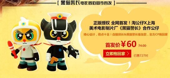 日前,阿里巴巴聯合上海美術電影制片廠合作推出了國漫淘公仔。在淘寶網站上,黑貓警長、白貓班長單個公仔售價37元,兩個公仔60元。除了銷售黑貓警長、白貓班長的淘公仔外,還有會唱葫蘆娃的葫蘆娃、舒克貝塔紀念馬克杯等經典國產老動畫周邊產品,以及十萬個冷笑話Q版動漫手辦、羅小黑創意陶瓷杯、秦時明月水木芳華筆記本等新銳優質國漫周邊產品。